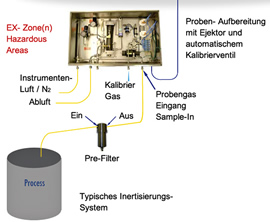 - Entnahme einer Messgasprobe aus dem Prozess und Aufbereitung zur Sicherstellung eines stabilen, sauberen Probenflusses über den Sauerstoffsensor